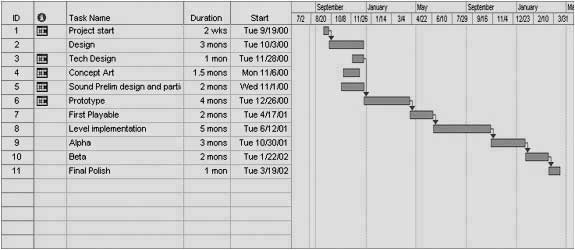 person online shooter with Contra IP without risking of disappointing them. Schedule Breakdown by man months: Project start .............................................................................2 weeks Design .....................................................................................3 months Tech Design .............................................................................1 month Concept art .............................................................................1.5 month Sound prelim ............................................................................2 months Prototype .................................................................................4 months First playable ............................................................................2 months Level implementation 1.5 months for each level (5 months in this example) Alpha ........................................................................................3 months Beta .........................................................................................2 months Final Polish ...............................................................................1 months